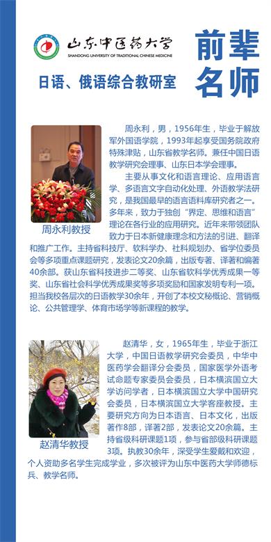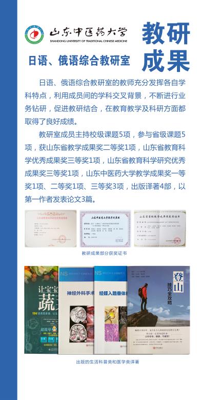 日语、俄语综合教研室现有专职教师2人,其中教授1人,讲师1人,其中一人为中国日语教学研究会委员、横滨国立大学客座教授。他们不仅具有扎实的业务能力,还在语言教学的基础上,结合我校中医药特色,利用语言专业优势,致力于中医药文化传播,并积极引进国外最新的养生保健理论和实际方式方法,主持或参与多项省部级课题,出版著作或译著多部,取得了丰硕的科研成果。