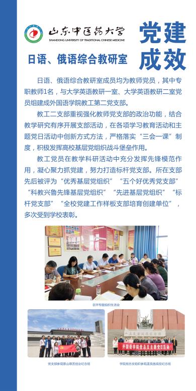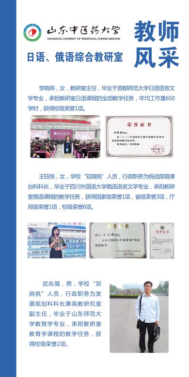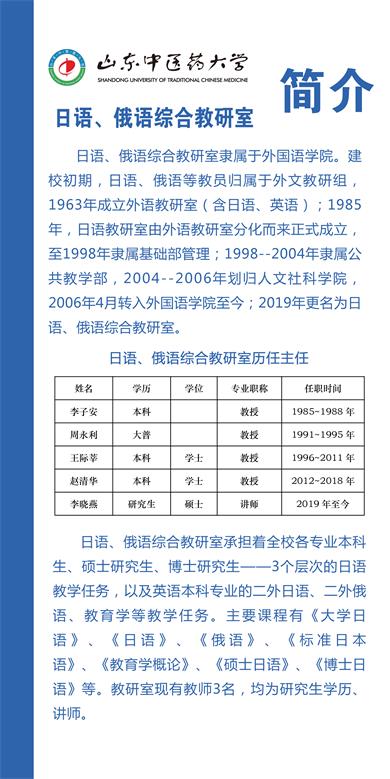 分管,2019年,外院整合日语、俄语师资力量,将俄语课程纳入其中,更名为日语、俄语综合教研室。