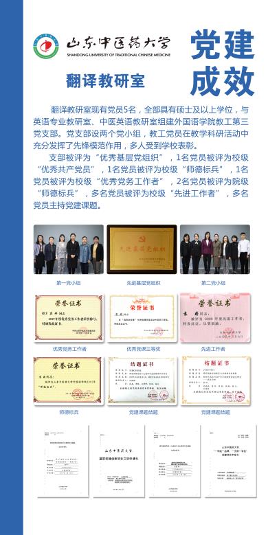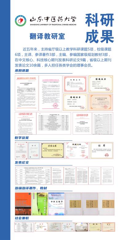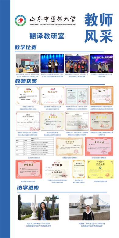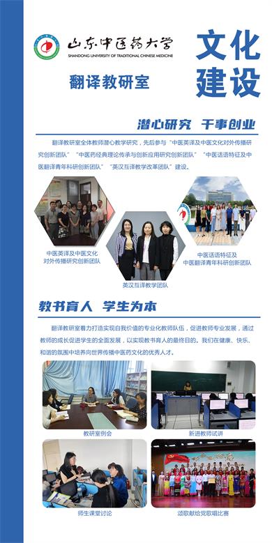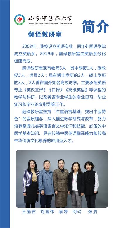 英语专业服务于“一带一路”和中医药文化“走出去”国家战略,对接山东省文化产业和语言服务行业,本着“注重语言基础、突出中医特色”的发展理念,培养掌握扎实英语语言文学知识和技能、必备的中医学基本知识、具有较强中医英语翻译能力和较高中华传统文化素养的应用型人才。2019年英语专业成功申报为山东省一流专业。