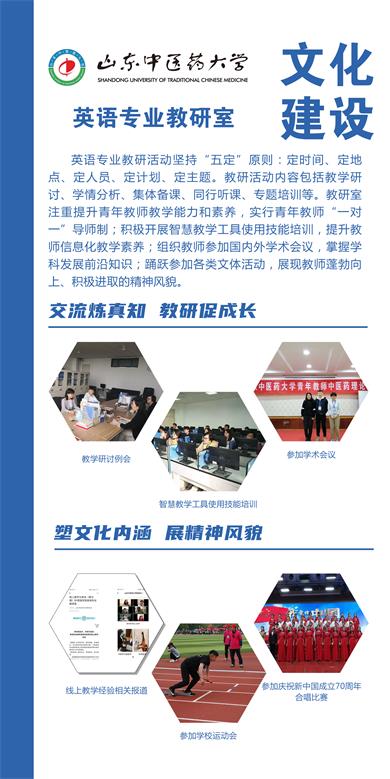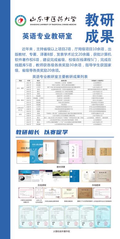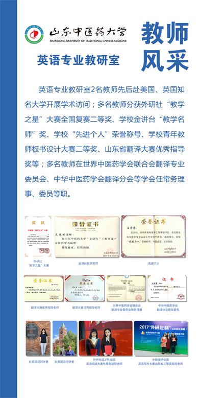 英语专业建设方面形成了自己的特色,确定了以英语语言文学为主干学科,以中医英语为特色的专业框架和培养适应医疗行业需求的、具有较高从业能力的应用型英语人才的办学方向,构建了与之相适应的课程体系,尤其加重了实践教学的比例,培养学生的岗位适应能力和创新意识。英语专业不断优化人才培养模式,提高教学质量,改善办学条件,取得了显著教学成果。