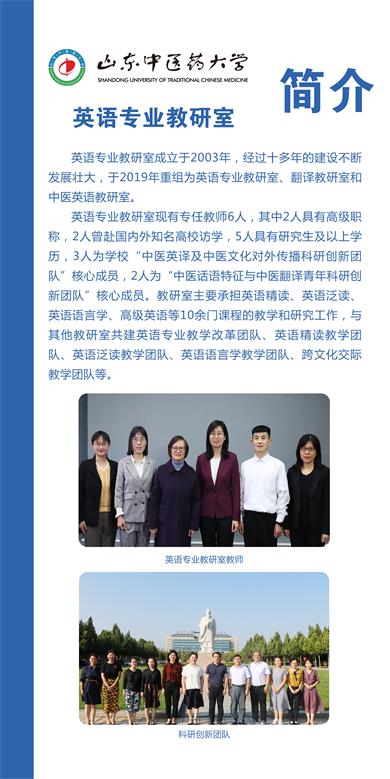2003年,我校设立英语专业,在充分利用我校中医药优势资源、突出专业发展特色的办学思路指引下,以英语语言文学为基础,以中医英语为特色,致力于培养培养适应我国和区域经济社会发展需要的,德、智、体全面发展的,具备较高人文素养的,系统扎实地掌握英语语言基础知识和基本技能,掌握必备的英语语言文化知识和初步的中医药知识,具有一定的英语语言综合运用能力,能胜任在教育、医药卫生、经贸、外事、新闻出版等行业从事翻译、教学、研究、管理等工作的高素质应用型英语专业人才。