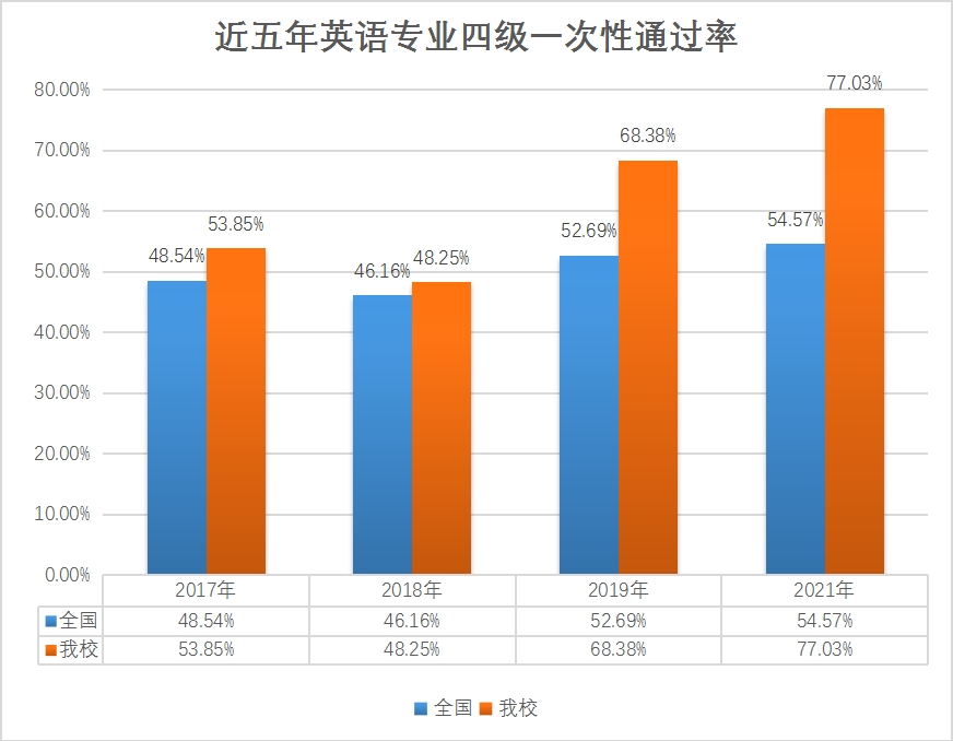附:近五年我校英语专业四级一次性通过率