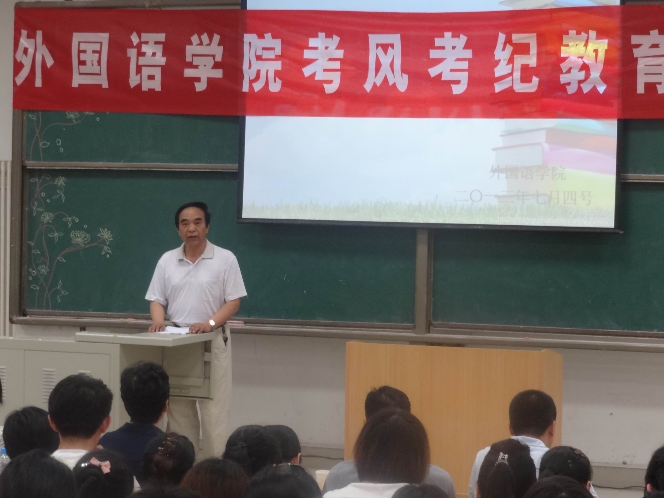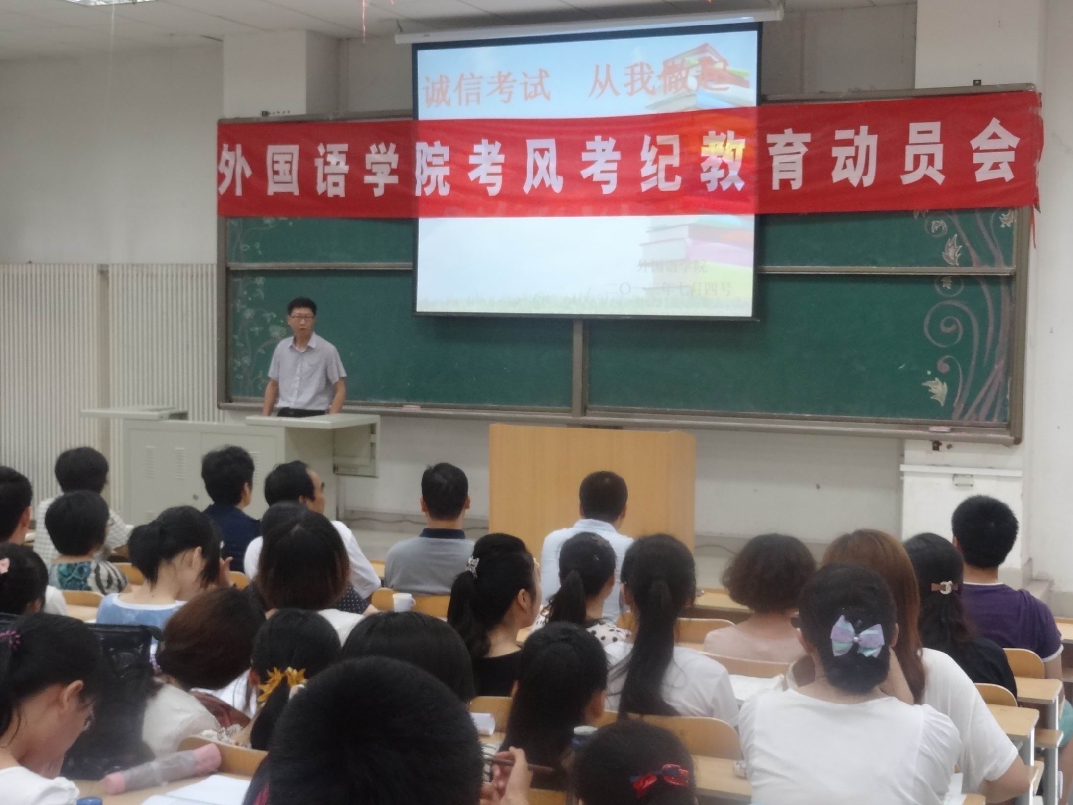 动员大会上,英语系教师范延妮代表全院教师做出庄严承诺、诚信监考;学生代表2011级2班王迪做出诚信考试的承诺,并向全院同学发出了诚信考试的倡议。