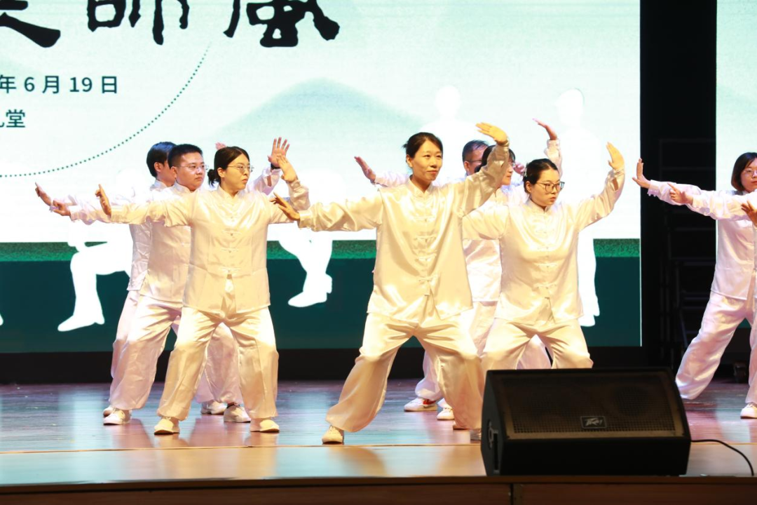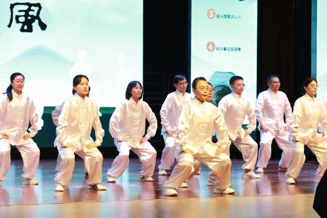 伴随清雅乐声,20名身着白色队服的教工代表以昂扬的姿态登场。托天之势沉稳如山,开弓之姿劲如松,俯仰间气韵绵长如云卷云舒。整套动作刚柔相济,沉肩坠肘如磐石定鼎,收势凝神若渊渟岳峙,完美诠释了中华传统健身功法中“松紧结合、动静相兼”的技术精髓,将养生功法转化为流动的文化诗篇,赢得在场观众的阵阵掌声。