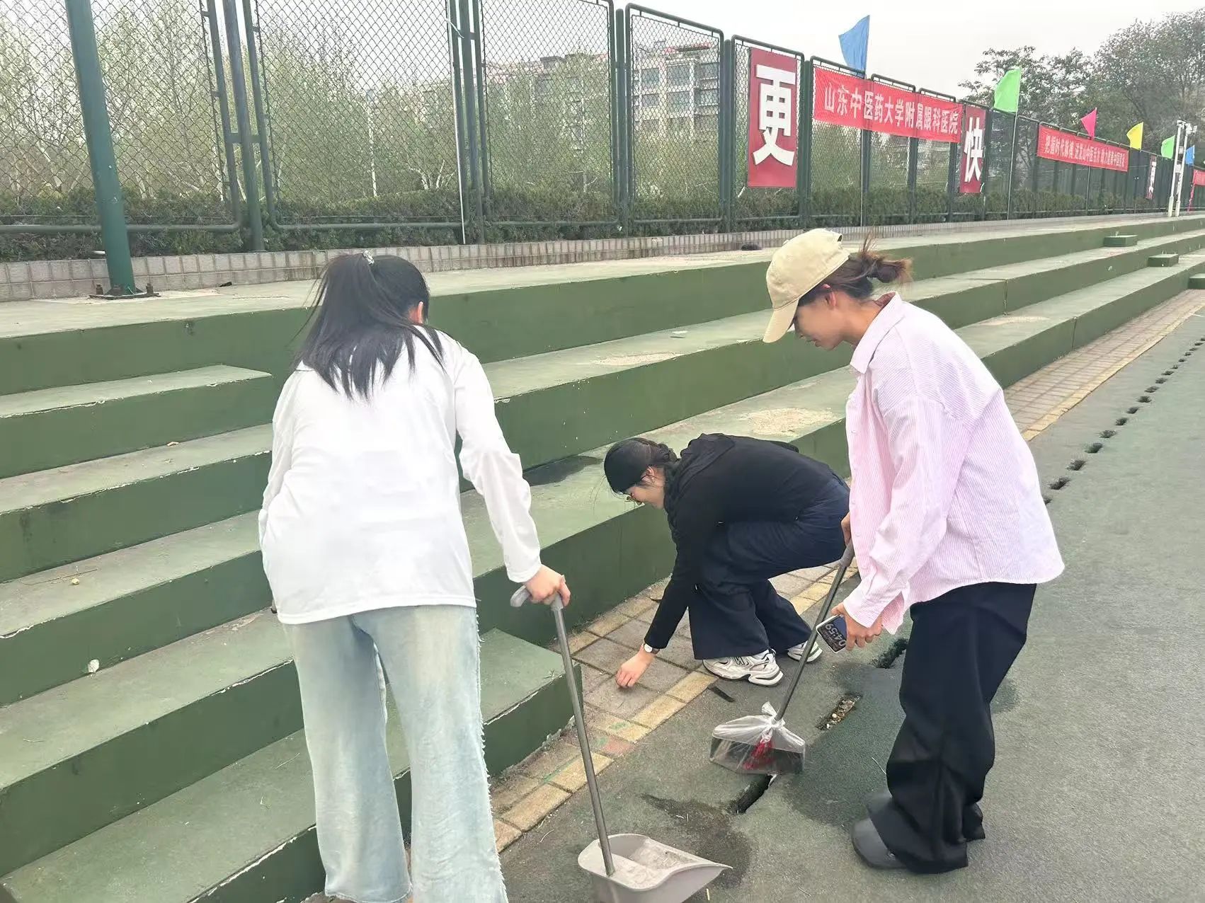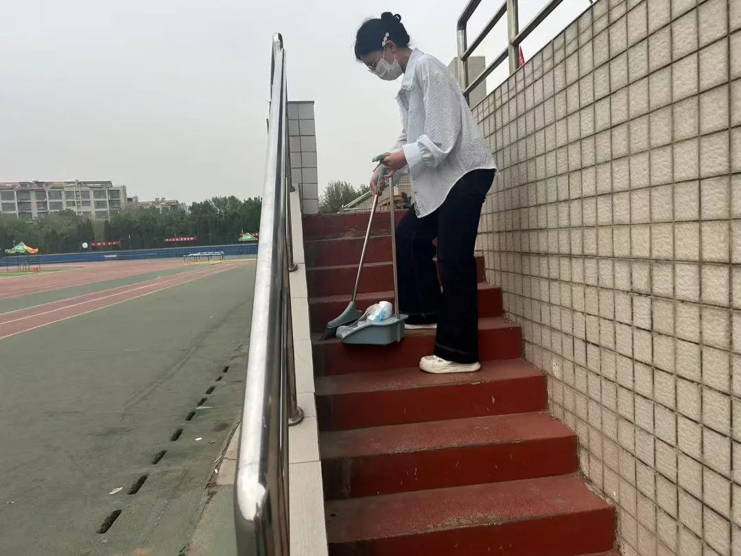 除了常规清扫,志愿者们还特别关注安全隐患排查。及时清理看台的积水,整理未归位的隔离墩,为运动会筑起安全防线。