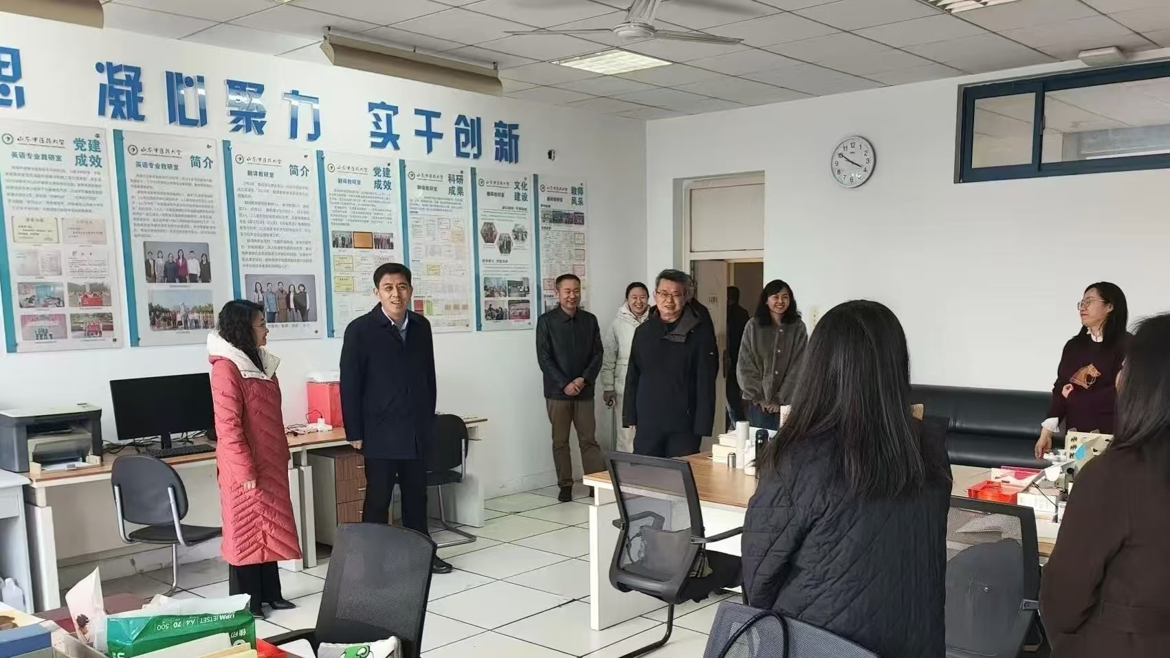 走访慰问过程中,张玉龙与教职工代表亲切交谈,细致询问大家的假期生活、工作规划及实际需求,认真倾听教职工对学院专业建设、人才培养、服务保障等方面的意见建议,并结合学校发展规划与学院特色,对学院新学期工作提出四点要求,一要坚持党建引领,推进党建业务深度融合,凝聚校友力量,赋能学院高质量发展。二要注重人才培养,推进大学英语分级教学改革,优化专业人才培养体系,提升育人质效。三要聚力科创攻坚,强化有组织科研,讲好中医药故事。四要筑牢安全底线,压实安全责任,守牢学院事业发展稳定大局。