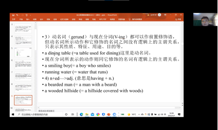 王莹老师采用雨课堂平台进行劳动与社会保障2021级01班等班级的大学英语II精读课授课。她认为线上教学对老师的课前准备和备课程度提出更高要求,学生对老师有了更高的期待。她在课前做充分的准备,与时俱进地在课本知识的基础上加入新亮点,使学生对课本的知识产生与时事结合的新连接,满足学生的学习需求;平台所具有的弹幕、开麦、随机点名等互动方式深受学生喜爱,讲授到重点知识时,采用启发诱导的方式,鼓励学生把答案打到弹幕上,学生积极性很高,课堂互动良好。