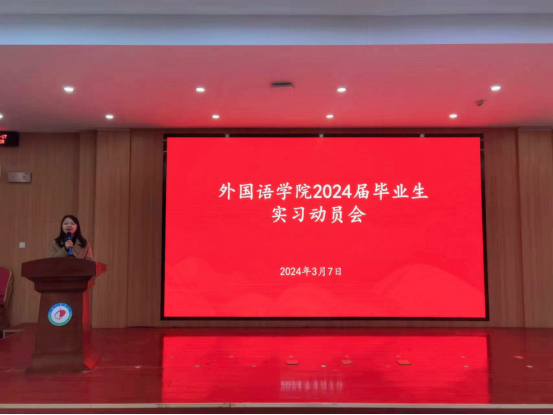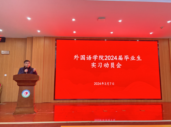 陈战代表学院作动员讲话。他指出,实习是检验教学水平和质量的重要标准,是检验学生能力的试金石。通过实习,学生可以扩大视野,由理论走向实践,提高对英语专业的深层次认知,为将来的学习和工作提供借鉴。同时,实习还能帮助学生了解就业市场行情,促进个人就业。因此,所有学生务必高度重视,选择与英语专业培养相关度大的岗位,认真参加实习,保证实习质量。