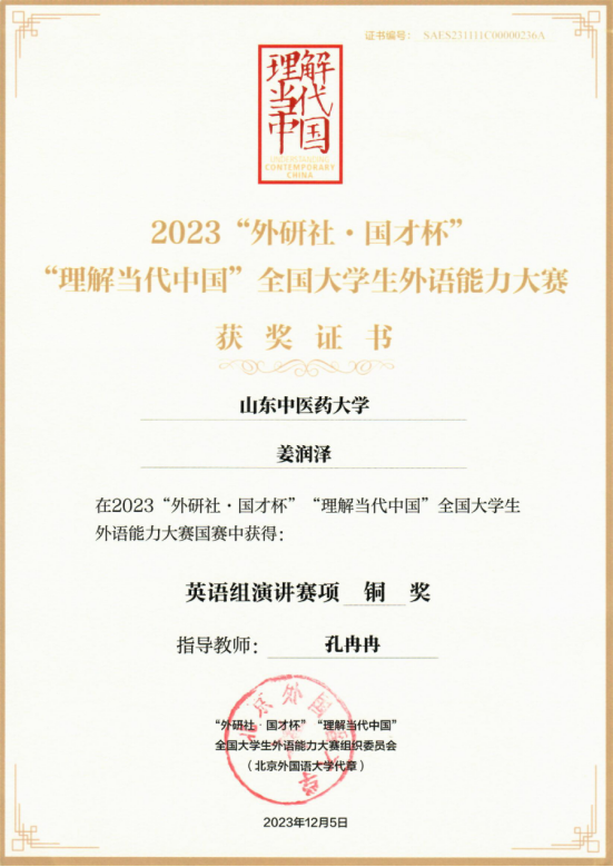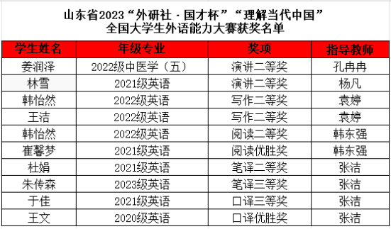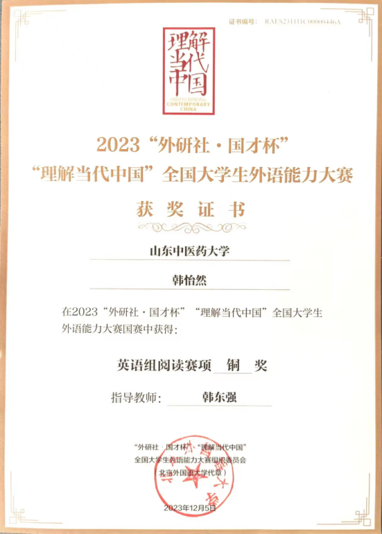 近日,由北京外国语大学主办,外语教学与研究出版社承办的2023年“外研社·国才杯”“理解当代中国”全国大学生外语能力大赛落下帷幕。在全国决赛中,我校英语专业22级学生韩怡然(指导老师:韩东强)、中医学(五)22级学生姜润泽(指导老师:孔冉冉)分别获得英语组阅读铜奖和英语组演讲铜奖。在省级复赛中,我校选手获二等奖6项、三等奖2项、优胜奖2项。