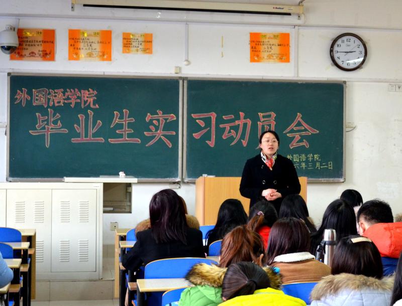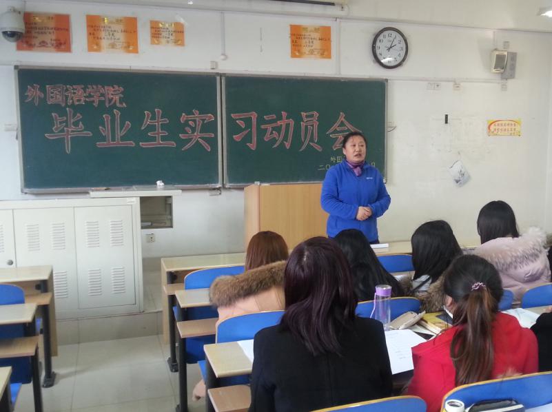 孙慧副院长做实习动员,从纪律、学习、安全、专八考试、论文及答辩等方面,对2016届毕业生提出要求和建议。希望同学们通过实习,将大学所掌握的专业知识及其它技能与实践相结合,使学生缩短学校教育与社会应用的距离,通过实践活动,锻炼学生的实际工作能力,提高综合素质。论文答辩方面,孙慧副院长建议同学们合理安排好时间,结合学生自己的毕业论文选题,有针对性地调研和收集资料,完成论文并顺利通过答辩。随后,宋挺老师着重讲解了实习报告、实习协议的填写注意事项。刘志梅副书记强调了实习期间安全问题,要求同学们注意个人安全、与辅导员老师保持联系、同学之间要互帮互助。最后,李晓璇老师提醒学生要有时间紧迫感,保证实习期间考研复试、“专八”考试、就业等任务顺利完成。