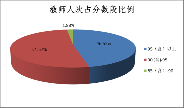 分以上的教师 223 人,占参评教师的 46.55%;90(含)-95 分的教师 247 人,占参评教师的 51.57%; 85(含)-90 分的教师 9 人,占参评教师的 1.88%。教师评教成绩具体分布情况如下:
