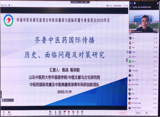 2023年11月18-19日,中国中医药研究促进会中医药翻译与国际传播专业委员会2023年会暨人工智能时代的中医药翻译与国际传播学术研讨会以线上线下结合的形式在深圳成功举行。副院长陈战教授应邀参加会议并做报告,学院部分教师线上参会学习。