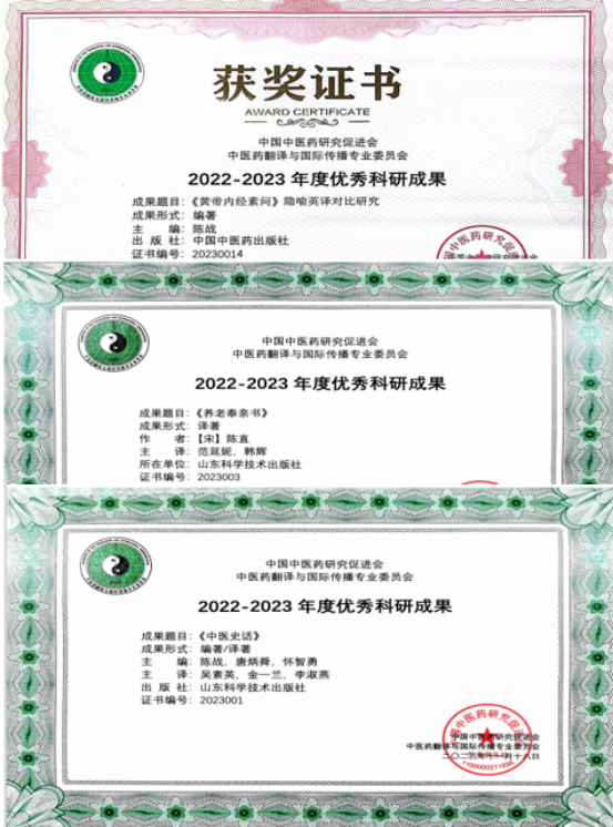 大会公布了中国中医药研究促进会中医药翻译与国际传播专业委员会2022-2023年度优秀科研成果、优秀论文评选结果。陈战主编的《〈黄帝内经素问〉隐喻英译对比研究》,范延妮等主译的《养老奉亲书》,陈战、吴素英、李淑燕等编译的《中医史话》被评为2022-2023年度优秀科研成果。李成华、孔冉冉撰写的论文《生态翻译学视阈下<黄帝内经>譬喻修辞翻译研究》,张喆、徐丽等撰写的论文《2022世界卫生组织中医国际标准术语与已有中医术语英译标准的比较——脏象术语部分》被评为2022-2023年度优秀论文。