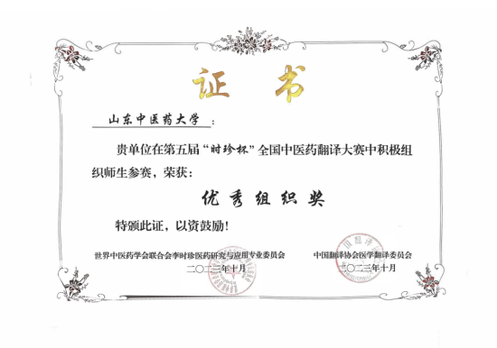 大会还举行了第五届“时珍杯”全国中医药翻译大赛颁奖典礼。我校获得优秀组织奖。