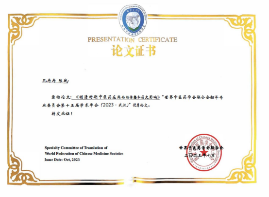 大会公布了世界中医药学会联合会翻译专业委员会第十五届国际学术年会优秀论文名单。孔冉冉副教授和陈战教授合著的论文《明清时期中医药在越南的传播和历史影响》被评为优秀论文。