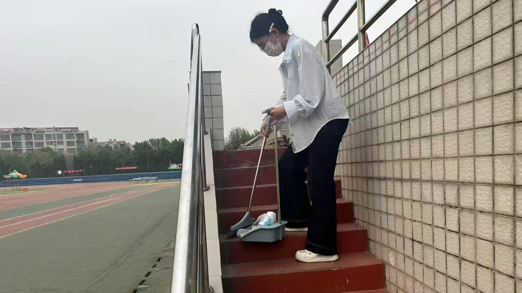 除了常规清扫,志愿者们还特别关注安全隐患排查。及时清理看台的积水,整理未归位的隔离墩,为运动会筑起安全防线。