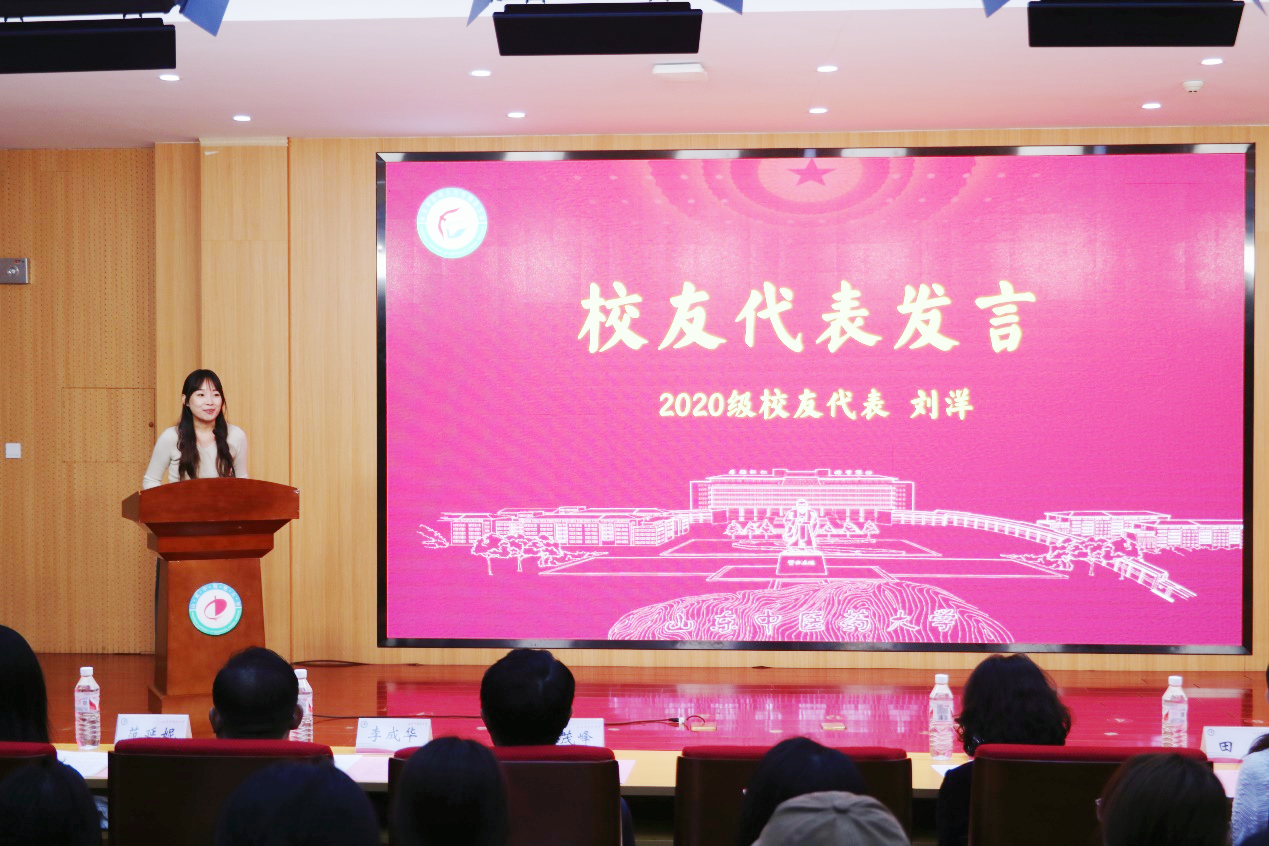2024级新生李思启代表全体新生表达了对于大学生活的美好憧憬与期待,立志为推动中医药国际化贡献自己力量。2021级在校生代表宫旭然代表在校生表达了对于新同学的祝愿和拥有美好未来的期许。2020级优秀校友代表刘洋以深入浅出的言语、充满启迪与激励的发言向同学们传授了宝贵的经验。
