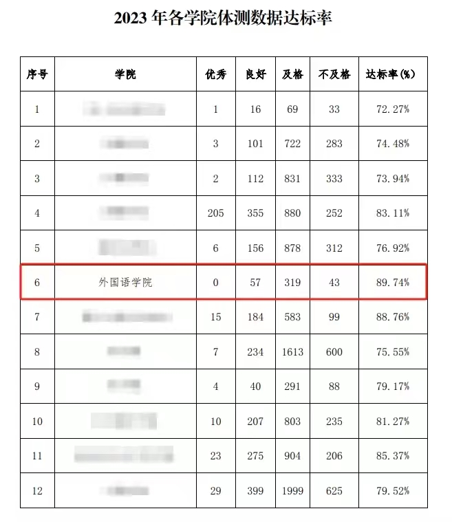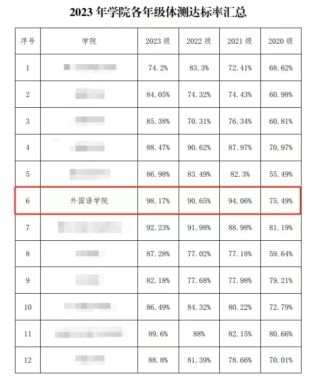 2023年体测数据达标率位居全校第一名!其中学院2021级、2023级达标率双双位列全校第一名,2022级达标率位居全校第二名,2020级达标率全校第四名。全学院整体达标率平均成绩位居全校第一!