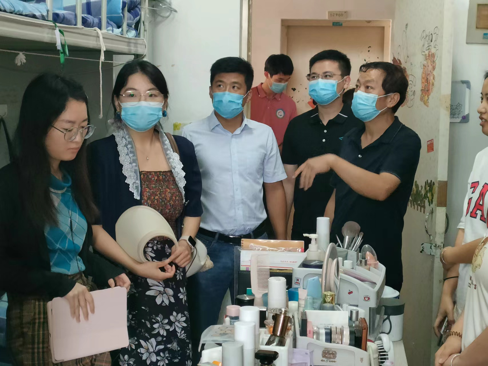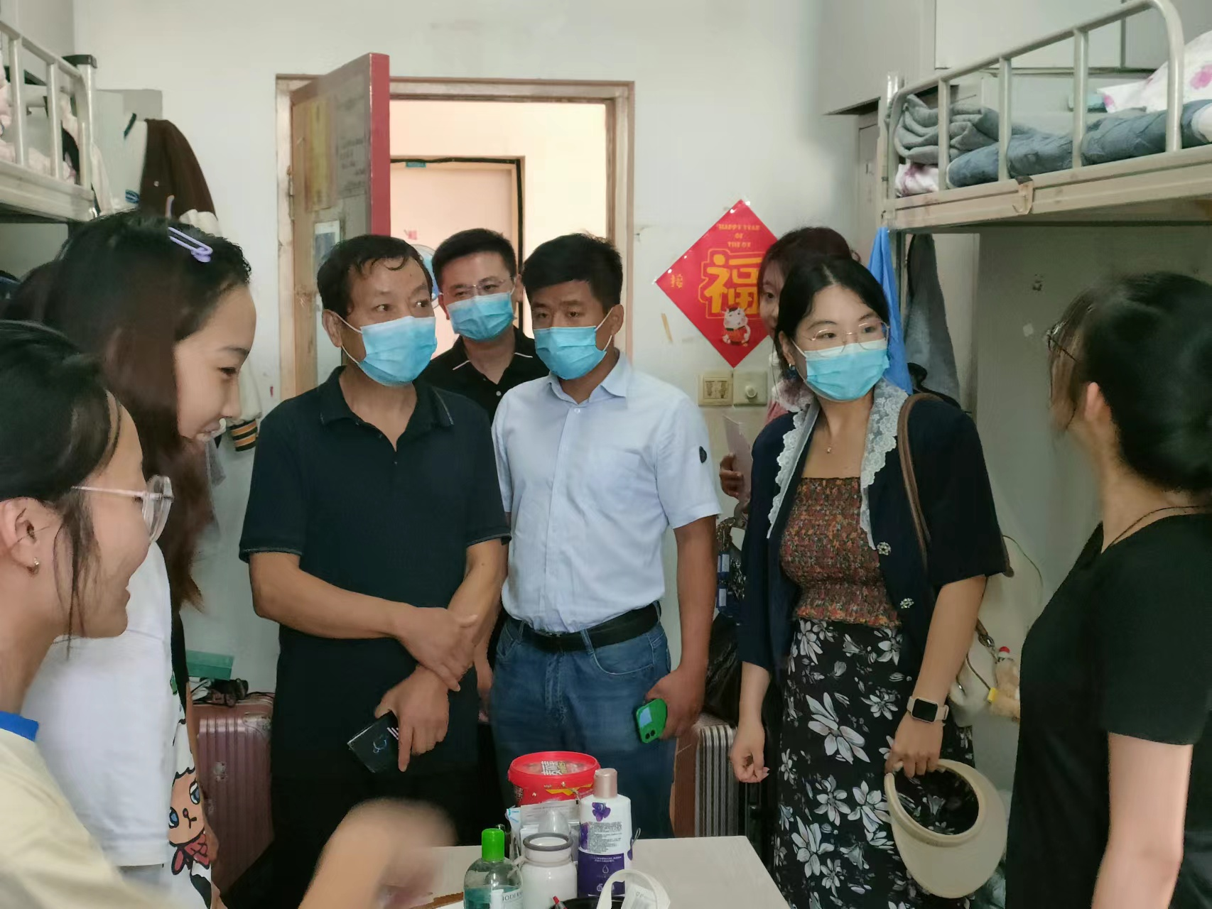 李子峰一行先后来到2号、8号、11号和15号宿舍楼抽查学生的宿舍卫生和安全。李子峰一行提醒同学们疫情期间应注意疫情防护,做好个人安全防护措施,积极面对疫情,保持乐观心态;确保宿舍卫生安全,以防安全隐患的发生。与此同时,李子峰鼓励同学们积极面对线上学习,不能松懈对待,相信没有什么困难是不能逾越的。