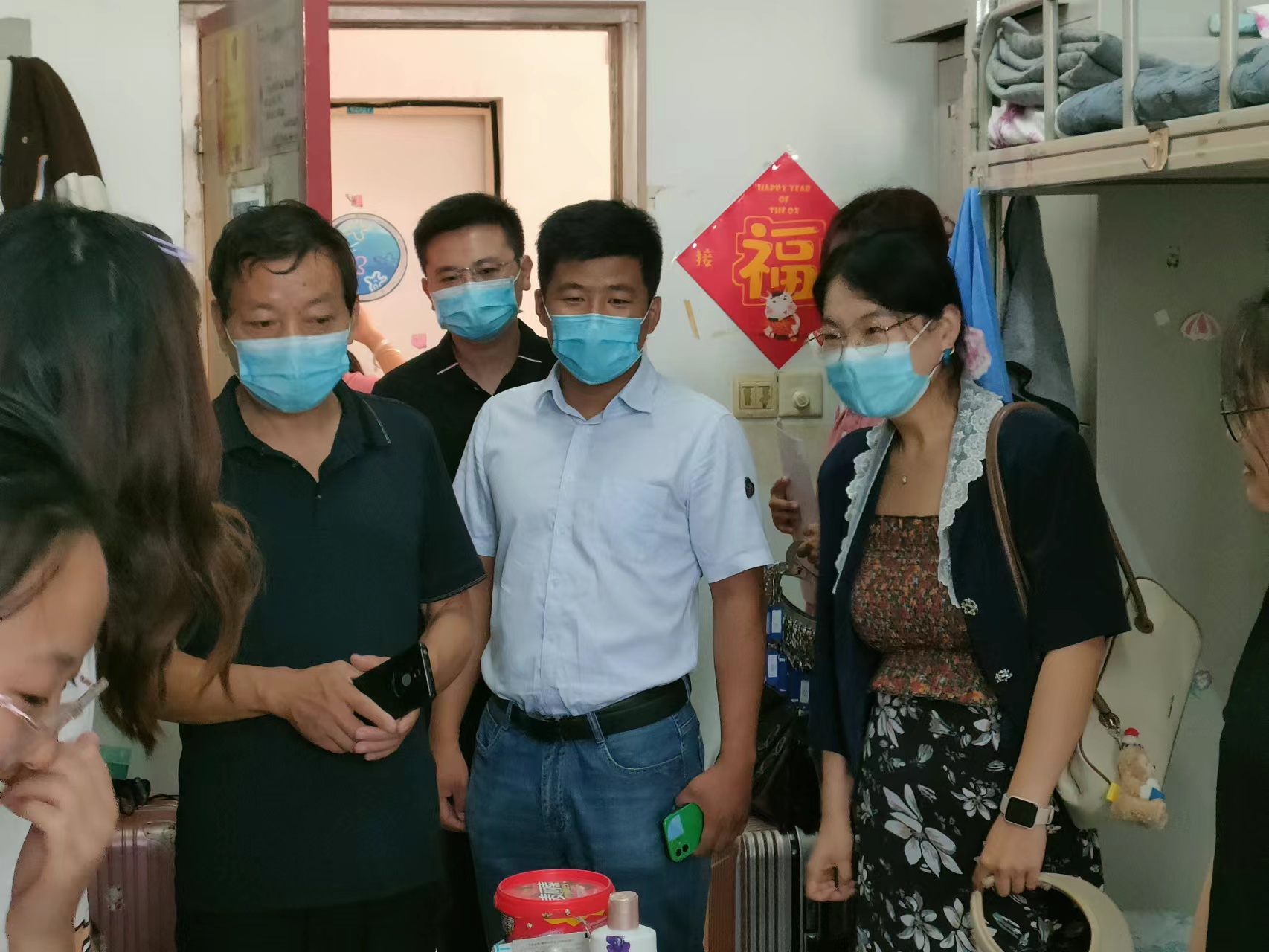 李子峰一行来到新生宿舍,慰问新生入学适应情况,希望他们在军训暂停的情况下,也能够保持积极乐观的心态,迎接美好的大一生活;同时鼓励他们要加强身体锻炼,内练筋骨,外强体魄,以康健的身体面对疫情,努力学习。