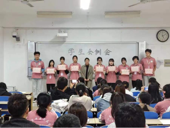 会议开始,赵文娜老师上台为学生会各部门部长颁发聘书,鼓励各部门部长在学生会工作中发挥先锋模范作用,做好身份转换,提高责任意识。