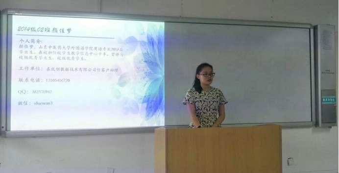 第三位主讲人颜佳梦,现工作于优创数据有限公司,任客户助理。颜佳梦介绍了现工作的公司的情况和自己目前工作任务,让同学们对职场生活有了一定了解。