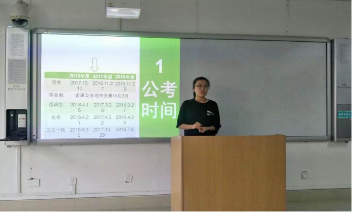 第一位主讲人刘妮妮,现已成功入围山东计划。刘妮妮给大家详细地讲解了国考、选调生、山东计划等备考的策略,鼓励同学们趁年轻多做些有意义的事情,增长见识。