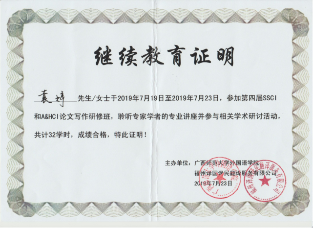 教工第三党支部书记袁婷,参加第四届SSCI和A&HCI论文写作研修班,获得结业证书。