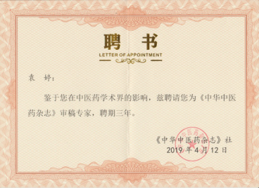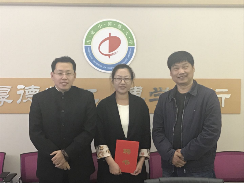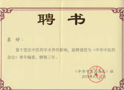 教工第三党支部支部书记袁婷,受聘《中华中医药杂志》青年编委和审稿专家,《中华中医药杂志》社长闫志安(右)颁发聘书。