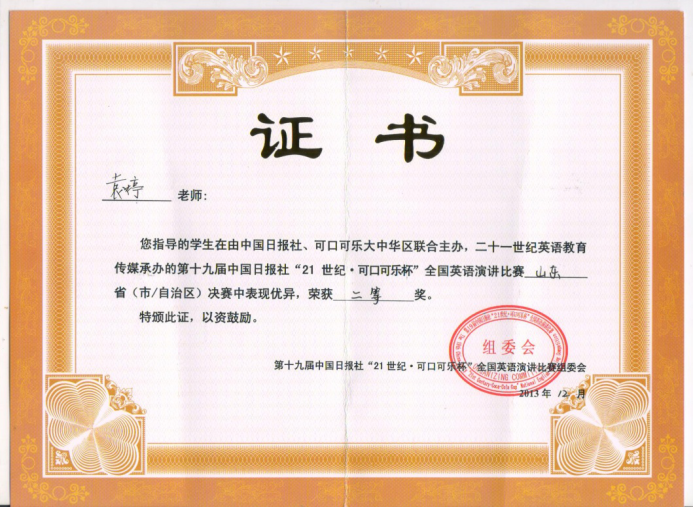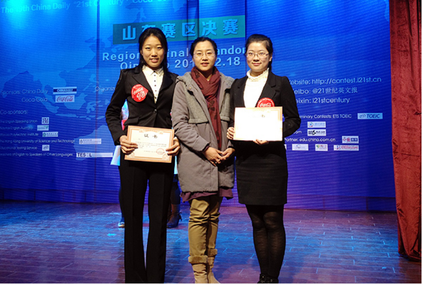 2012级学生吴亚男、护理学院2011级学生阎田园参加第19届中国日报“21世纪·可口可乐杯”全国英语演讲比赛山东赛区决赛,获得二等奖,同时袁婷获得优秀指导奖。
