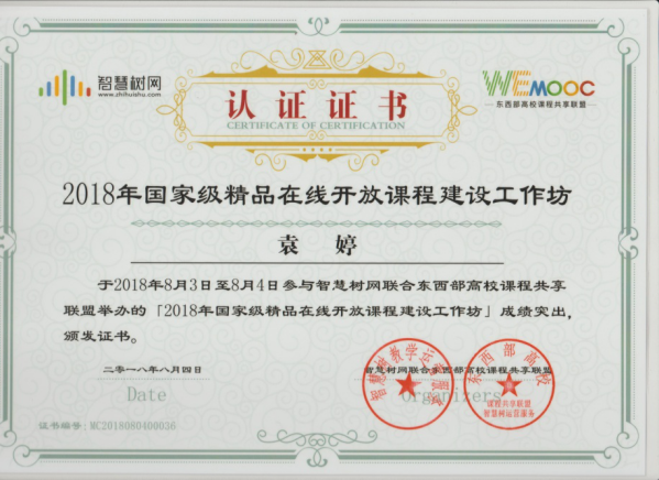 教工第三党支部书记袁婷,参加2018年国家级精品在线开放课程建设工作坊,获得结业证书。