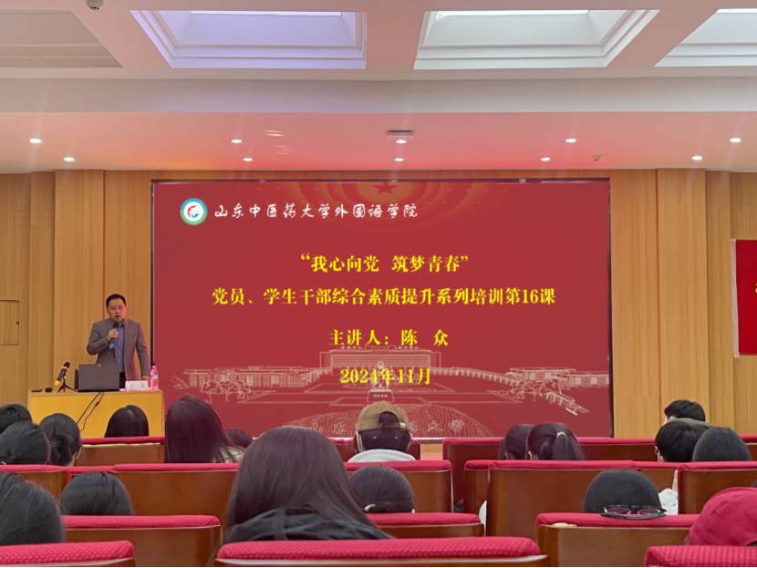 在三教一报告厅举办“我心向党 筑梦青春”党员、学生干部综合素质提升系列培训第16课。本次培训邀请学校党委委员、党委宣传部(教师工作部)部长陈众作《坚定理想信念 永远保持意识形态坚强定力》专题报告。